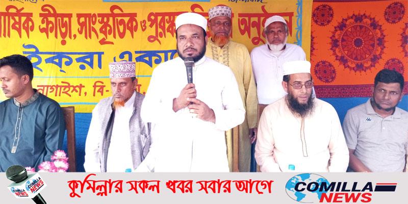 (১ মার্চ) শনিবার সকালে কুমিল্লা জেলার ব্রাহ্মণপাড়া উপজেলার নাগাইশ ইকরা একাডেমীতে বার্ষিক ক্রীড়া ও সাংস্কৃতিক প্রতিযোগীতার পুরষ্কার বিতরণ অনুষ্ঠানে প্রধান অতিথির বক্তব্যে কুমিল্লা-৫ (বুড়িচং-ব্রাহ্মণপাড়া) আসনের বাংলাদেশ জামায়াতে ইসলামীর মনোনীত প্রার্থী ও বুড়িচং-ব্রাহ্মণপাড়া উন্নয়ন ফোরাম এর চেয়ারম্যান ডক্টর এডভোকেট মোবারক হোসাইন এ কথাগুলো বলেন।