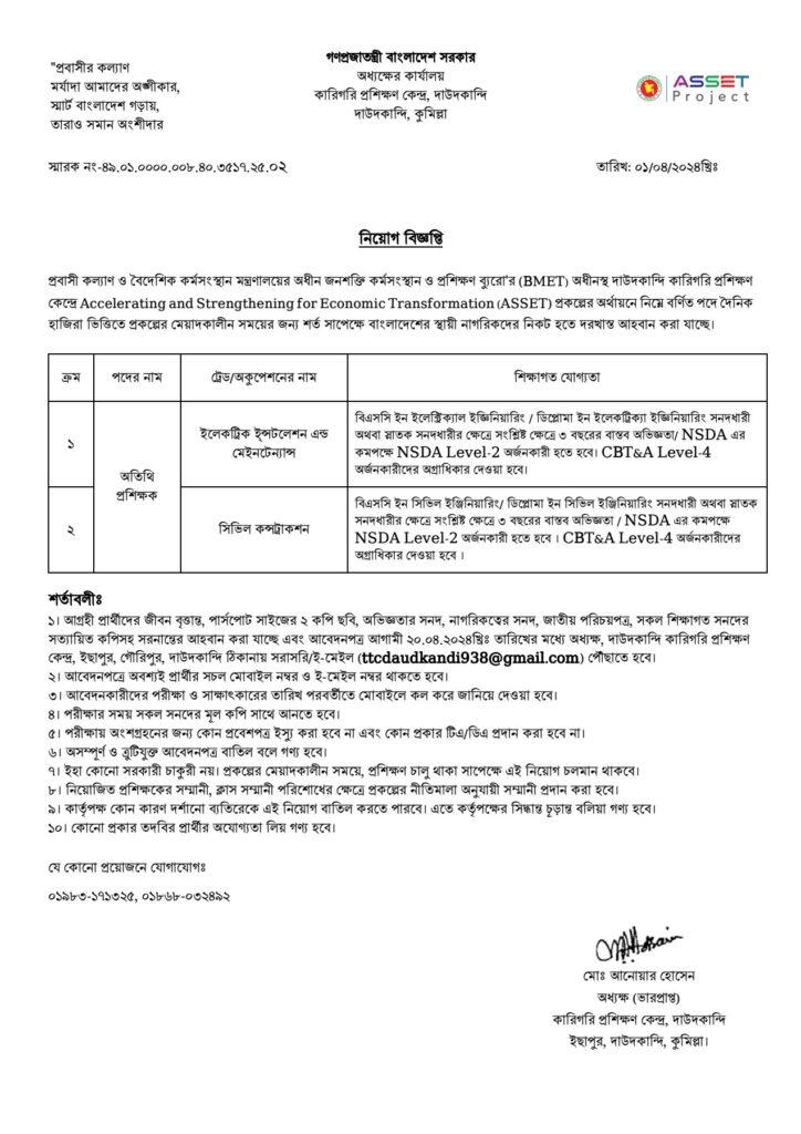 প্রবাসী কল্যাণ ও বৈদেশিক কর্মসংস্থান মন্ত্রণালয়ের অধীন জনশক্তি কর্মসংস্থান ও প্রশিক্ষণ ব্যুরো’র (BMET) অধীনস্থ দাউদকান্দি কারিগরি প্রশিক্ষণ কেন্দ্রে Accelerating and Strengthening for Economic Transformation (ASSET) প্রকল্পের অর্থায়নে নিম্নে বর্ণিত পদে দৈনিক হাজিরা ভিত্তিতে প্রকল্পের মেয়াদকালীন সময়ের জন্য শর্ত সাপেক্ষে বাংলাদেশের স্থায়ী নাগরিকদের নিকট হতে দরখাস্ত আহবান করা যাচ্ছে।