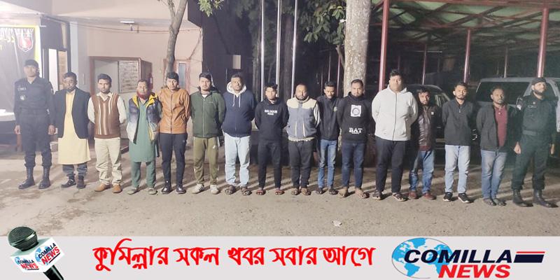 আটককৃতরা হলো- ১। মোঃ সাব্বির হোসেন (২৪), পিতা-মোঃ নজরুল ইসলাম, সাং-হাড়াতলী, থানা-সদর দক্ষিণ মডেল, জেলা-কুমিল্লা; ২। মোঃ সাফি মাহমুদ (২৮), পিতা-মৃত মঈন উদ্দিন, সাং-নোয়াপাড়া, থানা-কোতয়ালী মডেল, জেলা-কুমিল্লা; ৩। মোঃ সুজন (৪২), পিতা-মৃত ইদ্রিস মিয়া, সাং-ছোটরা, থানা-কোতয়ালী মডেল, জেলা-কুমিল্লা; ৪। তানজিদ হাসান (৩০), পিতা-তোফাজ্জল হোসেন, সাং-শিকারপুর, থানা-বুড়িচং, জেলা-কুমিল্লা, ৫। মোঃ জয়নাল আবেদীন (৫৩), পিতা-মৃত সুলতান মিয়া, সাং-নোয়াপাড়া, থানা-কোতয়ালী মডেল, জেলা-কুমিল্লা; ৬। মোঃ ইমরুল হক (৩২), পিতা-মোঃ মঞ্জুরুল হক, সাং-মোনসেফ বাড়ী, থানা-কোতয়ালী মডেল, জেলা-কুমিল্লা; ৭। মোঃ আলী (২৭), পিতা-সুলতান আহমেদ, সাং-মোহনপুর, থানা-চান্দিনা, জেলা-কুমিল্লা; ৮। মোঃ শাহাদাত হোসেন প্রিন্স (২৮), পিতা-মোঃ দেলোয়ার হোসেন রোমান, সাং-নতুন চৌধুরী পাড়া, থানা-কোতয়ালী মডেল, জেলা-কুমিল্লা; ৯। মোশারফ হোসেন সাকিব (২০), পিতা-মৃত আব্দুল মতিন, সাং-শাসনগাছা, থানা-কোতয়ালী মডেল, জেলা-কুমিল্লা; ১০। মোঃ রনি (২৩), পিতা-মোঃ রুক মিয়া, সাং-শংকরপুর, থানা-কোতয়ালী মডেল, জেলা-কুমিল্লা; ১১। ফয়সাল আহমেদ ইমন (২১), পিতা-বিল্লাল হোসেন, সাং-রাজাপুর, থানা-কোতয়ালী মডেল, জেলা-কুমিল্লা; ১২। জহির আহম্মেদ (২৬), পিতা-খোরশেদ আলম, সাং-দক্ষিণ ধনপুর, থানা-লালমাই, জেলা-কুমিল্লা; ১৩। পারভেজ (২২), পিতা-আবুল হোসেন, সাং-বরহাতুয়া, থানা-বরুড়া, জেলা-কুমিল্লা; ১৪। সিয়ামুল ইসলাম সৈকত (২০), পিতা-আলাউদ্দিন, সাং-মানিকারচর, থানা-মেঘনা, জেলা-কুমিল্লা।