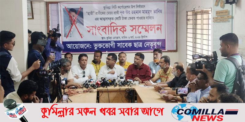 কুমিল্লা সিটি কর্পোরেশন মেয়র পদে উপ নির্বাচনে হাতী প্রতীকের প্রার্থী নূর উর রহমান তানিম এর বিরুদ্ধে কোটি টাকা আত্মসাতের অভিযোগ করেছেন কুমিল্লার সাবেক কয়েকজন ছাত্রনেতা। তানিমকে প্রতারক নেতা উল্লেখ করে এই নির্বাচনে ভোট না দিতে ও অর্থ সহয়তা না করতে কুমিল্লা নগরবাসীর প্রতি আহবানও জানান তারা।