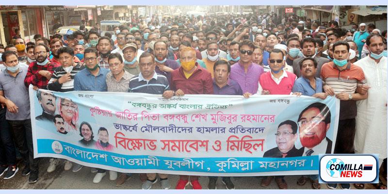 কুষ্টিয়ায় বঙ্গবন্ধুর ভাস্কর্য ভাংচুরের সাথে জড়িতদের আটক ও দৃষ্টান্তমূলক শাস্তির দাবিতে বিক্ষোভ মিছিল এবং পথ সভা করেছে কুমিল্লা মহানগর যুবলীগ। রোববার বেলা ৪ টায় প্রতিবাদ মিছিল বের করেন মহানগর যুবলীগ।