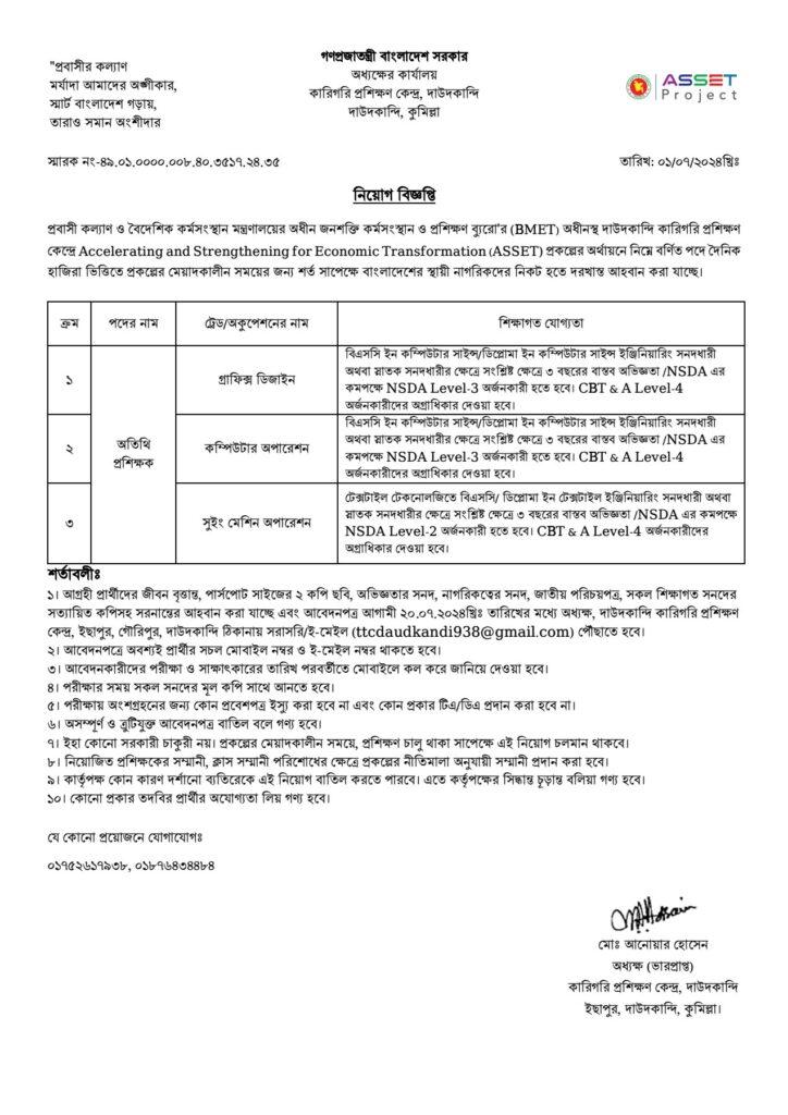 প্রবাসী কল্যাণ ও বৈদেশিক কর্মসংস্থান মন্ত্রণালয়ের অধীন জনশক্তি কর্মসংস্থান ও প্রশিক্ষণ ব্যুরো’র (BMET) অধীনস্থ দাউদকান্দি কারিগরি প্রশিক্ষণ কেন্দ্রে Accelerating and Strengthening for Economic Transformation (ASSET) প্রকল্পের অর্থায়নে নিম্নে বর্ণিত পদে দৈনিক হাজিরা ভিত্তিতে প্রকল্পের মেয়াদকালীন সময়ের জন্য শর্ত সাপেক্ষে বাংলাদেশের স্থায়ী নাগরিকদের নিকট হতে দরখাস্ত আহবান করা যাচ্ছে।