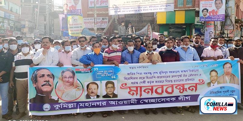 বঙ্গবন্ধুর ভাস্কর্য নিয়ে বিরোধিতা ও কটুক্তি প্রতিবাদে কুমিল্লায় মানবন্ধন করেছে স্বেচ্ছাসেবকলীগ নেতাকর্মীরা। রবিবার বেলা ১১ টা থেকে বেলা ১২ টা পর্যন্ত নগরীর কান্দিরপাড় পূবালী চত্বরে এ মানবন্ধন অনুষ্ঠিত হয়। এ সময় মানবন্ধনে উপস্থিত নেতাকর্মীরা স্বাধীনতা ও বঙ্গবন্ধুকে নিয়ে মুর্হমূহ স্লোগান দেন।