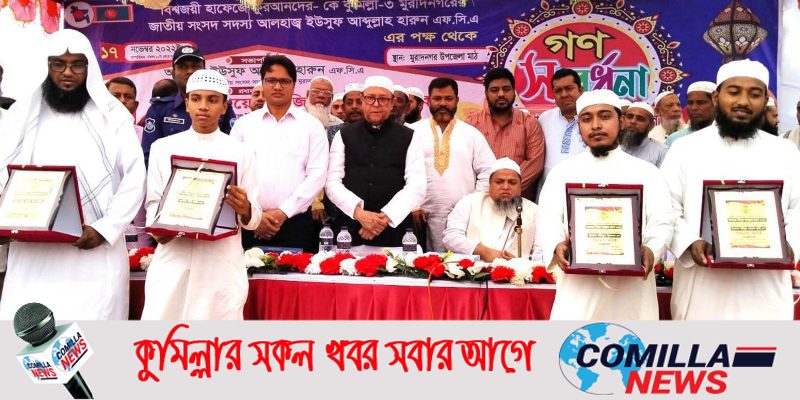 আন্তর্জাতিক পুরস্কারপ্রাপ্ত বিশ্বসেরা তিন হাফেজে কুরআন ও তাদের উস্তাদকে সংবর্ধনা দেওয়া হয়েছে। বৃহস্পতিবার কুমিল্লার মুরাদনগর উপজেলা পরিষদ মাঠে এক জমকালো আয়োজনে এ সংবর্ধনা দেওয়া হয়।